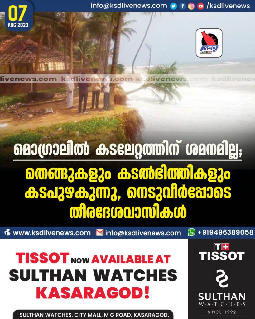 മൊഗ്രാലിൽ കടലേറ്റത്തിന് ശമനമില്ല; തെങ്ങുകളും കടൽഭിത്തികളും കടപുഴകുന്നു, നെടുവീർപ്പോടെ തീരദേശവാസികൾ