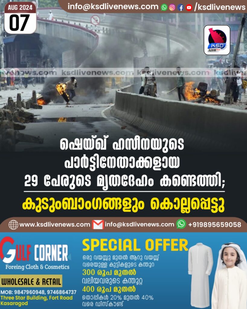 ഷെയ്ഖ് ഹസീനയുടെ പാർട്ടിനേതാക്കളായ 29 പേരുടെ മൃതദേഹം കണ്ടെത്തി; കുടുംബാംഗങ്ങളും കൊല്ലപ്പെട്ടു