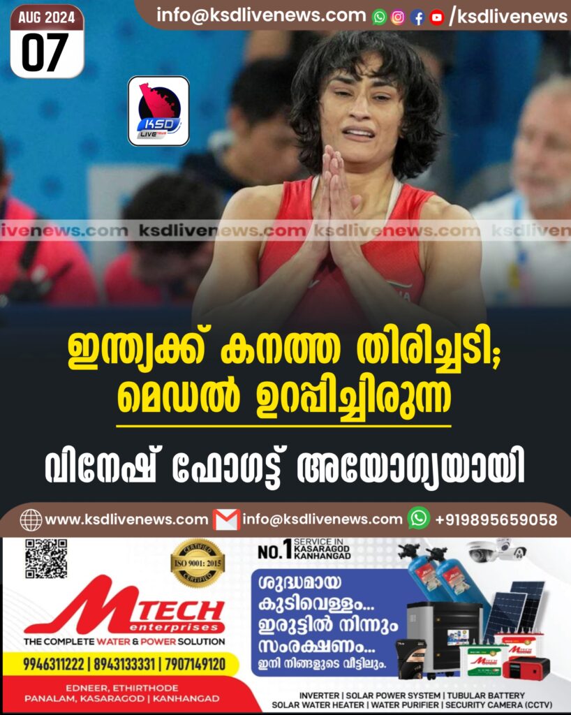 ഇന്ത്യക്ക് കനത്ത തിരിച്ചടി: മെഡല് ഉറപ്പിച്ചിരുന്ന വിനേഷ് ഫോഗട്ട് അയോഗ്യയായി