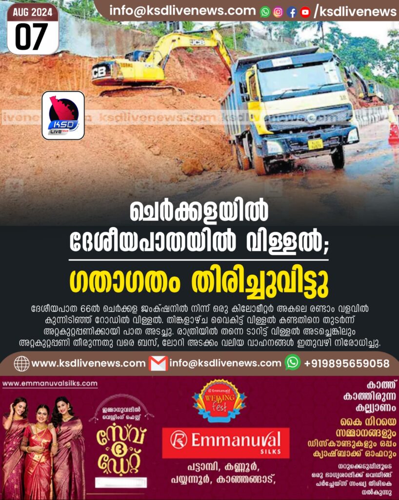 ചെർക്കള: ദേശീയപാത 66ൽ ചെർക്കള ജംക്ഷനിൽ നിന്ന് ഒരു കിലോമീറ്റർ അകലെ രണ്ടാം വളവിൽ കുന്നിടിഞ്ഞ് റോഡിൽ വിള്ളൽ. തിങ്കളാഴ്ച വൈകിട്ട് വിള്ളൽ കണ്ടതിനെ തുടർന്ന് അറ്റകുറ്റപ്പണിക്കായി പാത അടച്ചു. രാത്രിയിൽ തന്നെ ടാറിട്ട് വിള്ളൽ അടച്ചെങ്കിലും അറ്റകുറ്റപ്പണി തീരുന്നതു വരെ ബസ്, ലോറി അടക്കം വലിയ വാഹനങ്ങൾ ഇതുവഴി നിരോധിച്ചു. പ്രദേശത്ത് മണ്ണിടിച്ചിൽ ഭീഷണിയുണ്ടെന്ന് നാട്ടുകാർ പരാതിപ്പെട്ടു. ഇവിടെ ദേശീയപാതയ്ക്ക് 10 മീറ്ററോളം താഴ്ചയിൽ സംരക്ഷണ ഭിത്തി നിർമിക്കുന്നതിനുള്ള ജോലിക്കിടെ മുൻ ദിവസങ്ങളിലും മണ്ണിടിച്ചിൽ ഉണ്ടായിരുന്നു. കനത്ത മഴയിൽ വീടുകൾ ഉൾപ്പെടെ അപായ ഭീഷണിയാണെന്ന് നാട്ടുകാർ പറയുന്നു.