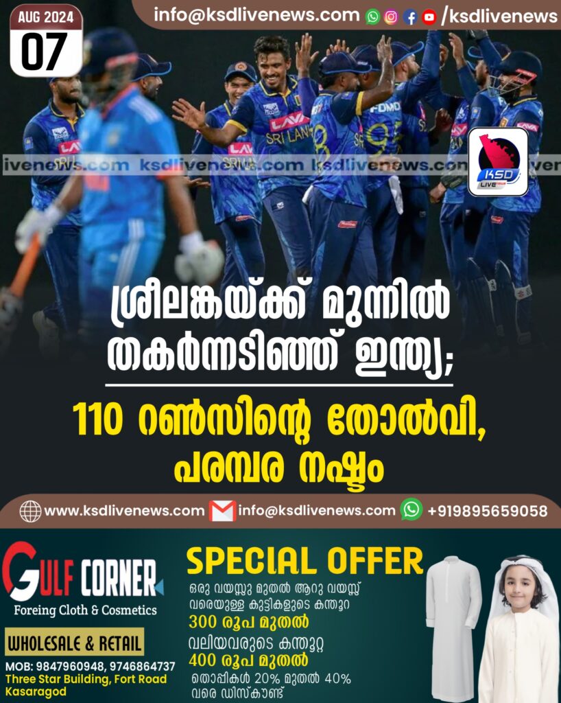 ശ്രീലങ്കയ്ക്ക് മുന്നിൽ തകർന്നടിഞ്ഞ് ഇന്ത്യ; 110 റൺസിന്റെ തോൽവി, പരമ്പര നഷ്ടം