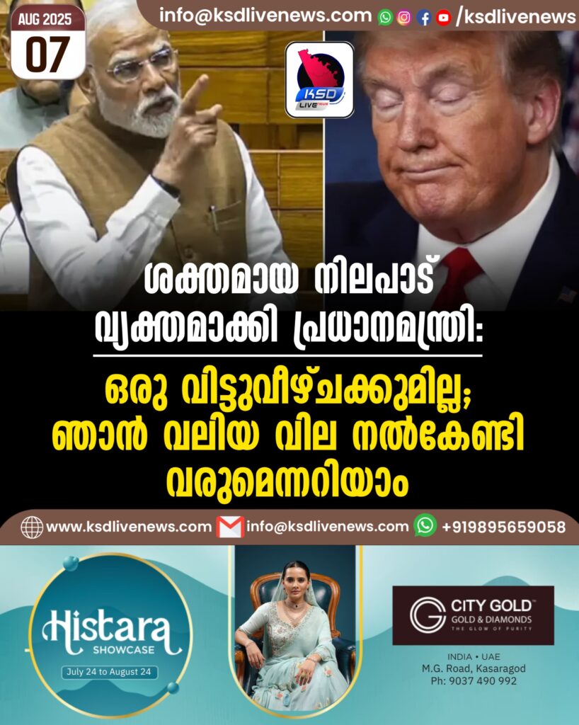 ദില്ലി: ഇന്ത്യക്കെതിരെ യുഎസ് പ്രസിഡന്റ് ഡോണള്ഡ് ട്രംപ് താരിഫ് യുദ്ധം ശക്തമാക്കിയതിന് പിന്നാലെ നിലപാട് വ്യക്തമാക്കി പ്രധാനമന്ത്രി നരേന്ദ്ര മോദി