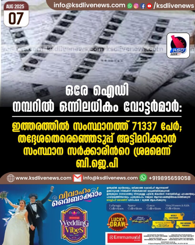 ഒരേ ഐഡി നമ്പറില് ഒന്നിലധികം വോട്ടര്മാര്: ഇത്തരത്തില് സംസ്ഥാനത്ത് 71337 പേര്; തദ്ദേശതെരെഞ്ഞെടുപ്പ് അട്ടിമറിക്കാൻ സംസ്ഥാന സര്ക്കാരിന്റെ ശ്രമമെന്ന് ബി.ജെ.പി