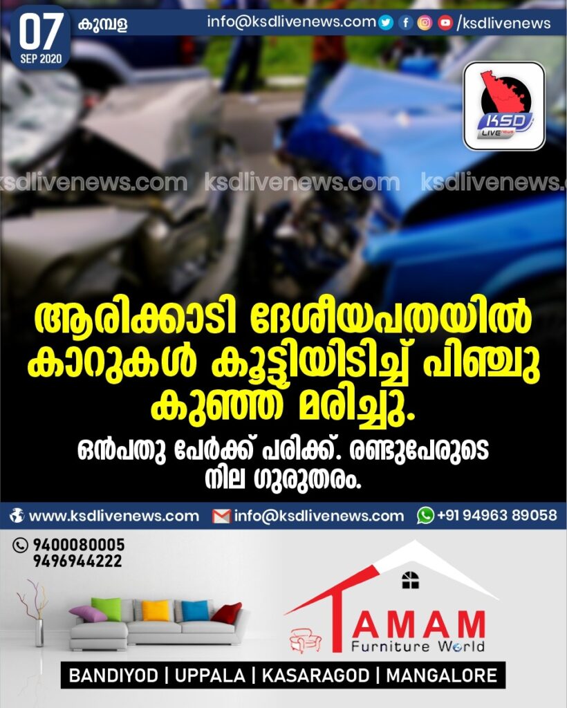 ആരിക്കാടി ദേശീയപതയിൽ കാറുകൾ കൂട്ടിയിടിച്ച് പിഞ്ചു കുഞ്ഞ് മരിച്ചു. ഒൻപതു പേർക്ക് പരിക്ക്. രണ്ടുപേരുടെ നില ഗുരുതരം.