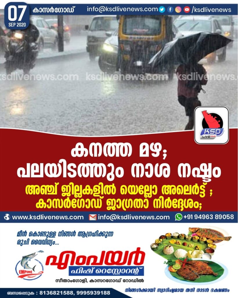 കനത്ത മഴ ; പലയിടത്തും നാശ നഷ്ടം ; അഞ്ച് ജില്ലകളിൽ യെല്ലോ അലെർട്ട് ; കാസർഗോഡ് ജാഗ്രതാ നിർദ്ദേശം