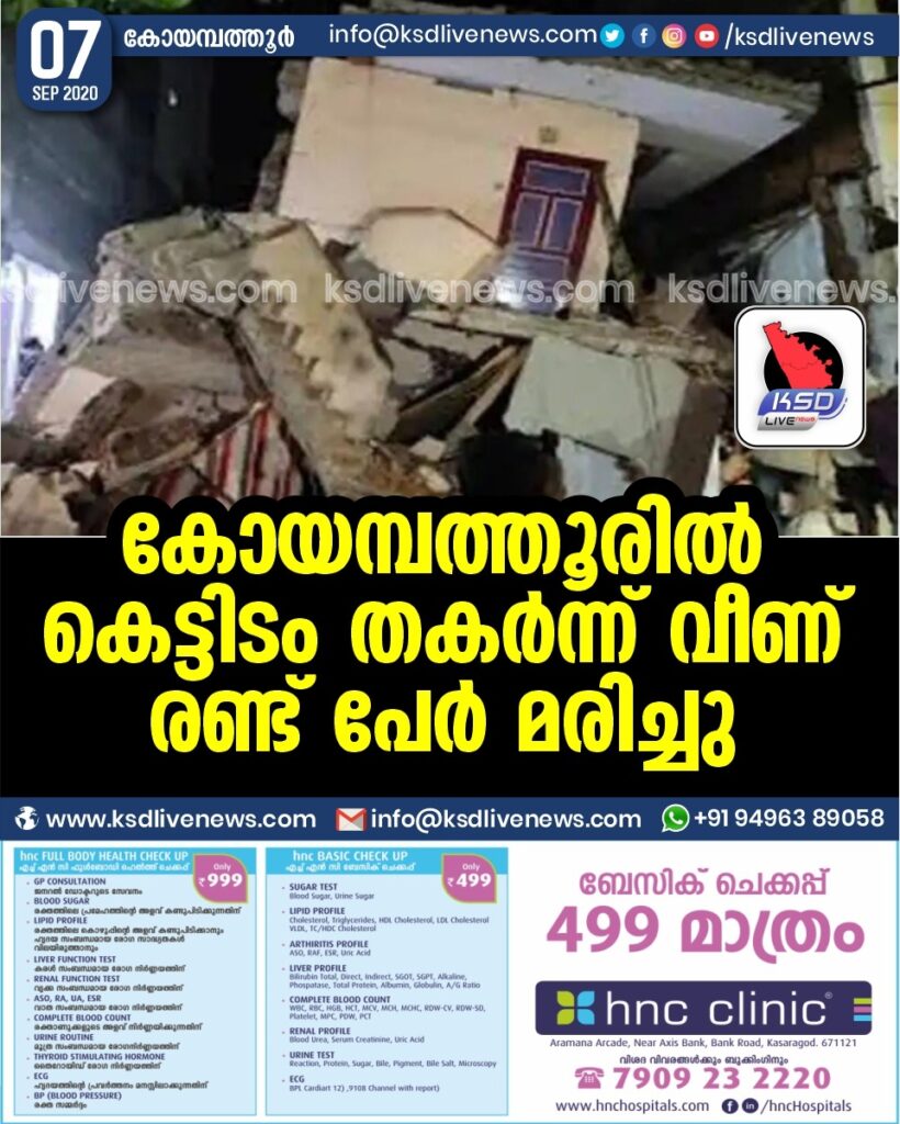 കോയമ്പത്തൂരിൽ കെട്ടിടം തകർന്ന് വീണ് രണ്ട് പേർ മരിച്ചു