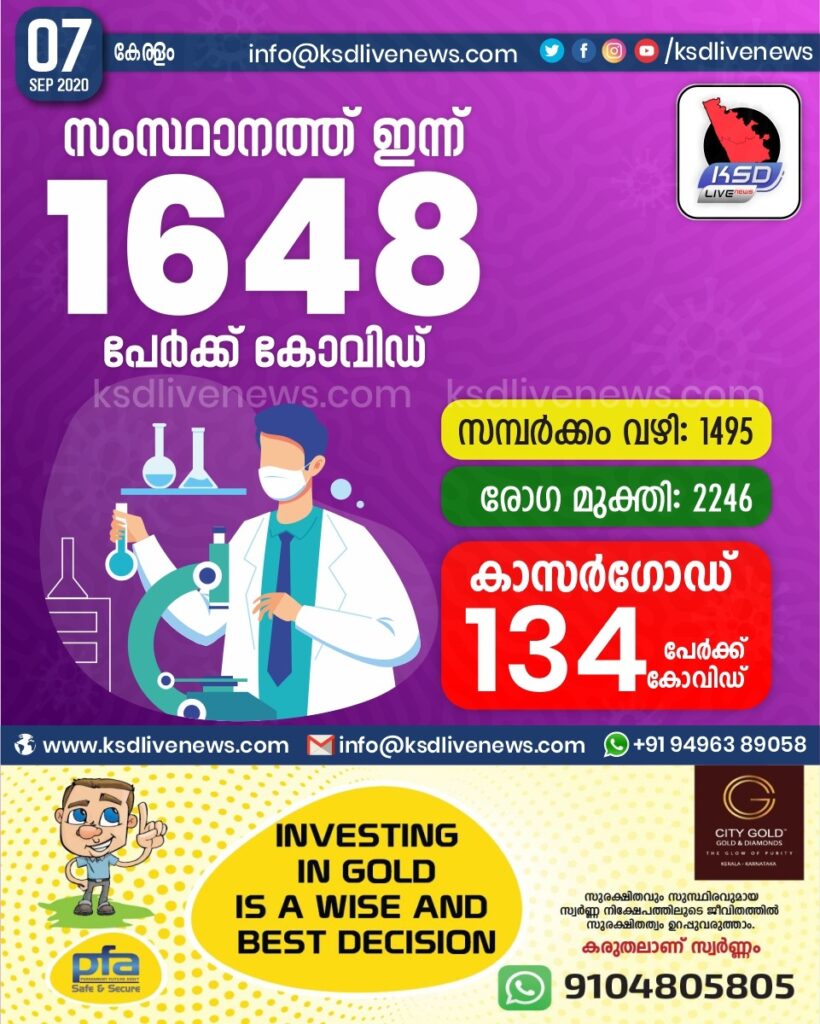 സംസ്ഥാനത്ത് ഇന്ന് 1648 പേർക്ക് കോവിഡ് സ്ഥിരീകരിച്ചു. സമ്പർക്കം വഴി 1495 പേർക്കും.രോഗ മുക്തി 2246 പേർക്കും. കാസർഗോഡ് ജില്ലയിൽ ഇന്ന് 134 പേർക്ക് കോവിഡ് സ്ഥിരീകരിച്ചു. മരണം 12