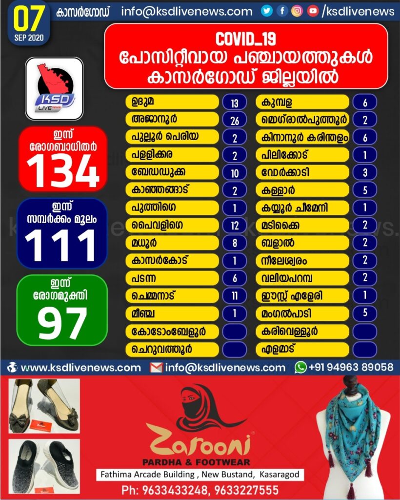 കാസർഗോഡ് ജില്ലയിൽ ഇന്ന് കോവിഡ് പോസിറ്റീവായവരുടെ പഞ്ചായത്ത് തിരിച്ചുള്ള സ്ഥിതി വിവര കണക്ക്