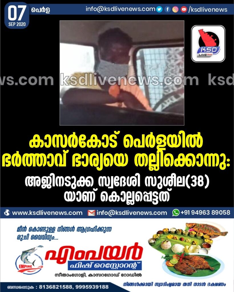 കാസര്കോട് പെര്ളയില് ഭര്ത്താവ് ഭാര്യയെ തല്ലിക്കൊന്നു: അജിനടുക്ക സ്വദേശി സുശീല(38) യാണ് കൊല്ലപ്പെട്ടത്