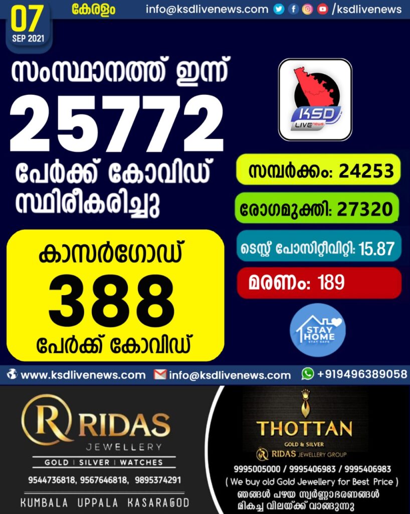 സംസ്ഥാനത്ത് ഇന്ന് 25,772 പേർക്ക് കോവിഡ് സ്ഥിരീകരിച്ചു. സമ്പർക്കം വഴി 24,253 പേർക്കും ; ആശ്വാസമായി 27,320 പേർക്ക് രോഗ മുക്തി; കാസർഗോഡ് ജില്ലയിൽ 388 പേർക്ക് പുതിയ കോവിഡ് കേസുകൾ ; മരണം 188