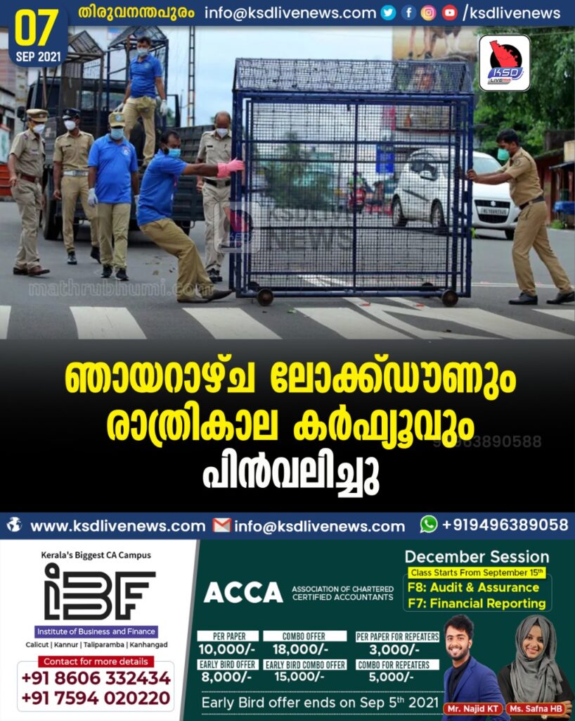 ഞായറാഴ്ച ലോക്ക്ഡൗണും രാത്രികാല കര്‍ഫ്യൂവും പിന്‍വലിച്ചു