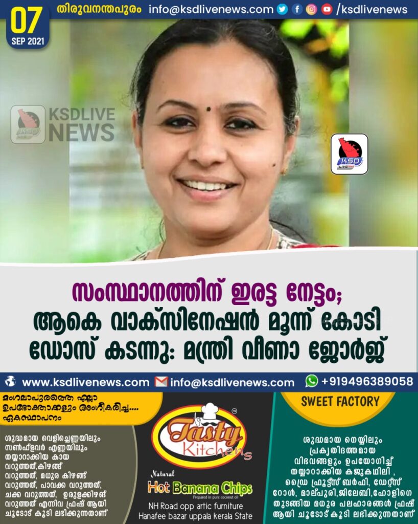 സംസ്ഥാനത്തിന് ഇരട്ട നേട്ടം; ആകെ വാക്സിനേഷന് മൂന്ന് കോടി ഡോസ് കടന്നു: മന്ത്രി വീണാ ജോര്ജ്