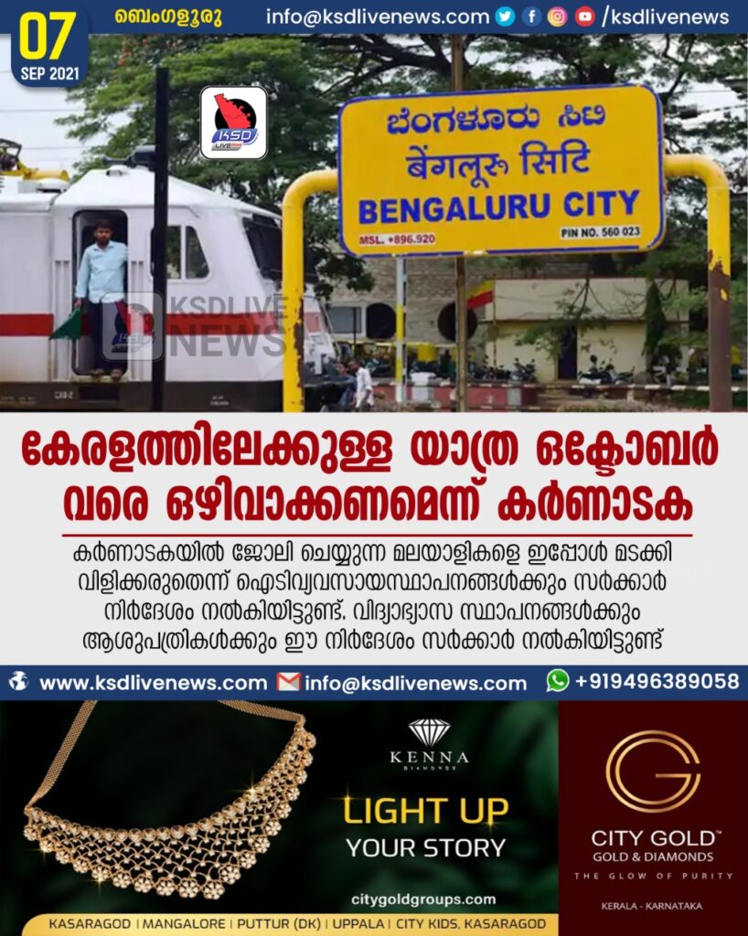 ബെംഗളൂരു: കേരളത്തിലേക്കുള്ള യാത്ര ഒക്ടോബർ വരെ ഒഴിവാക്കണമെന്ന് കർണാടക സർക്കാർ. പൊതുജനങ്ങൾക്ക് നൽകിയ അറിയിപ്പിലാണ് കേരളത്തിലേക്കുള്ള യാത്ര ഒഴിവാക്കണമെന്ന് കർണാടക സർക്കാർ നിർദേശിക്കുന്നത്. അടിയന്തരപ്രാധാന്യമില്ലാത്ത കാര്യങ്ങളിൽ കേരളസന്ദർശനം ഒഴിവാക്കണമെന്നാണ് ജനങ്ങളോടുള്ള കർണാടക സർക്കാരിൻ്റെ അഭ്യർത്ഥന. കർണാടകയിൽ ജോലി ചെയ്യുന്ന മലയാളികളെ ഇപ്പോൾ മടക്കി വിളിക്കരുതെന്ന് ഐടി-വ്യവസായസ്ഥാപനങ്ങൾക്കും സർക്കാർ നിർദേശം നൽകിയിട്ടുണ്ട്. വിദ്യാഭ്യാസ സ്ഥാപനങ്ങൾക്കും ആശുപത്രികൾക്കും ഈ നിർദേശം സർക്കാർ നൽകിയിട്ടുണ്ട്.