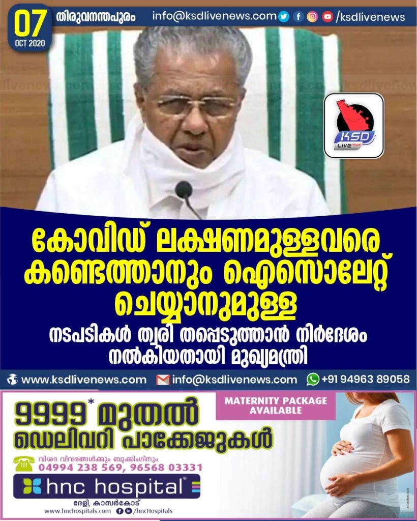 കോവിഡ് ലക്ഷണമുള്ളവരെ കണ്ടെത്താനും ഐസൊലേറ്റ് ചെയ്യാനുമുള്ള നടപടികൾ ത്വരി തപ്പെടുത്താൻ നിർദേശം നൽകിയതായി മുഖ്യമന്ത്രി