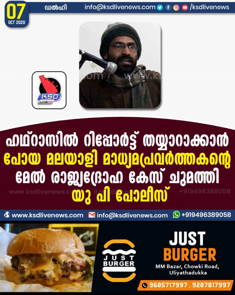 ഹഥ്റാസിൽ റിപ്പോർട്ട് തയ്യാറാക്കാൻ പോയ മലയാളി മാധ്യമപ്രവർത്തകന്റെ മേൽ രാജ്യദ്രോഹ കേസ് ചുമത്തി യു പി പോലീസ്