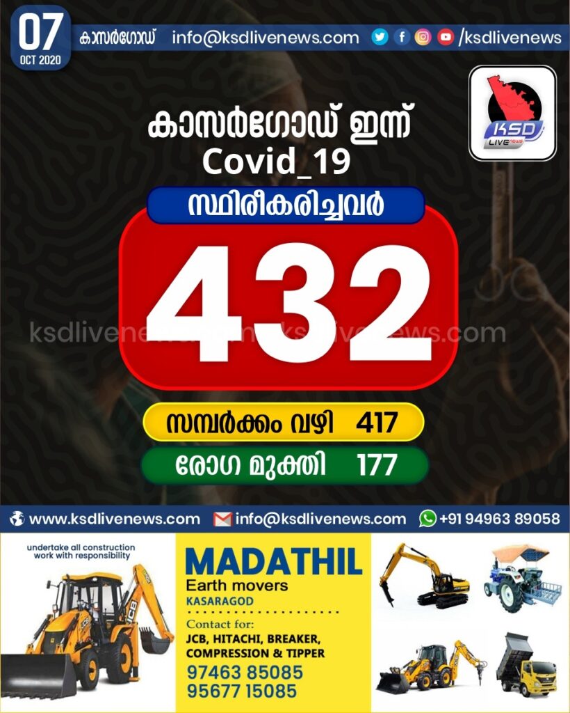 കാസർഗോഡ് ജില്ലയിൽ ഇന്ന് 432 പേർക്ക് കോവിഡ് സ്ഥിരീകരിച്ചു. സമ്പർക്കം വഴി 417 പേർക്കും. 177 പേർക്ക് രോഗ മുക്തി
