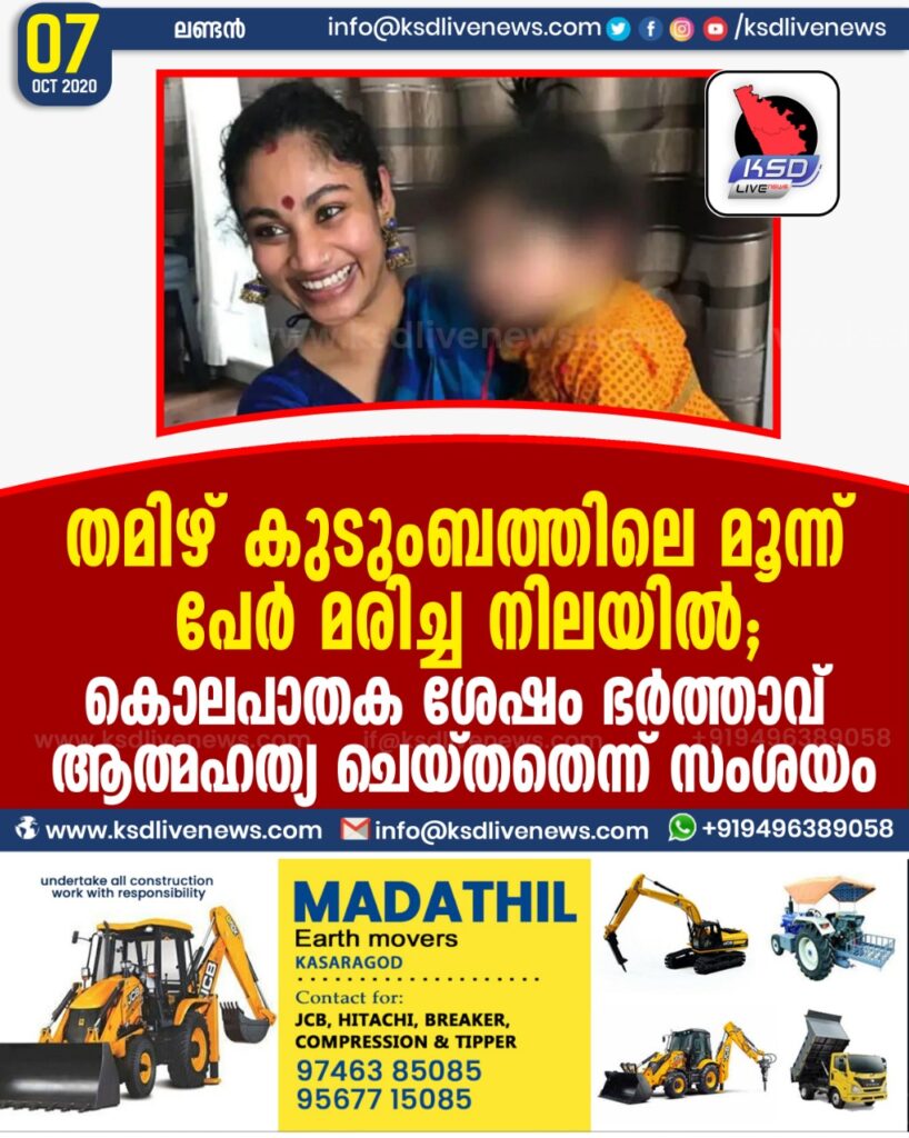 തമിഴ് കുടുംബത്തിലെ മൂന്ന് പേർ മരിച്ച നിലയിൽ ; കൊലപാതക ശേഷം ഭർത്താവ് ആത്മഹത്യ ചെയ്തതെന്ന് സംശയം