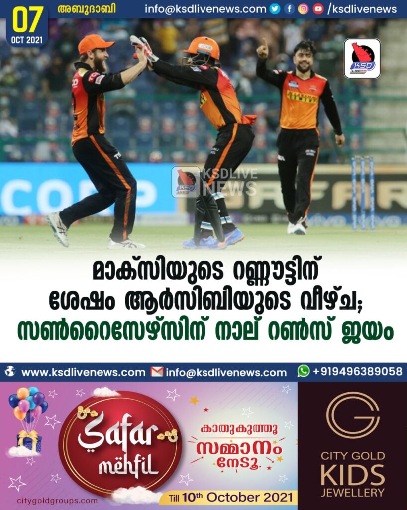25 പന്തിൽ 40 റൺസ് നേടിയ ഗ്ലെന് മാക്സ്വെൽ റണ്ണൗട്ട് ആയതോടെ സൺറൈസേഴ്സ് മത്സരത്തിൽ സാധ്യത കാണുകയായിരുന്നു.