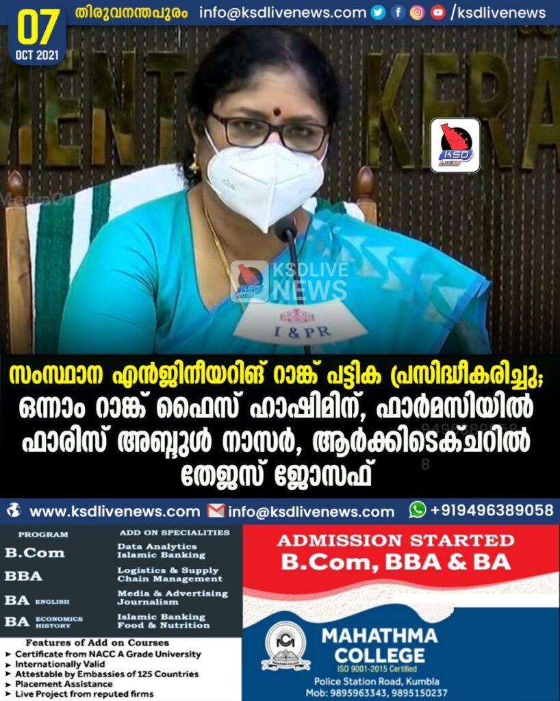 സംസ്ഥാന എന്ജിനീയറിങ് റാങ്ക് പട്ടിക പ്രസിദ്ധീകരിച്ചു; ഒന്നാം റാങ്ക് ഫൈസ് ഹാഷിമിന്, ഫാര്മസിയില് ഫാരിസ് അബ്ദുള് നാസര്, ആര്ക്കിടെക്ചറില് തേജസ് ജോസഫ്