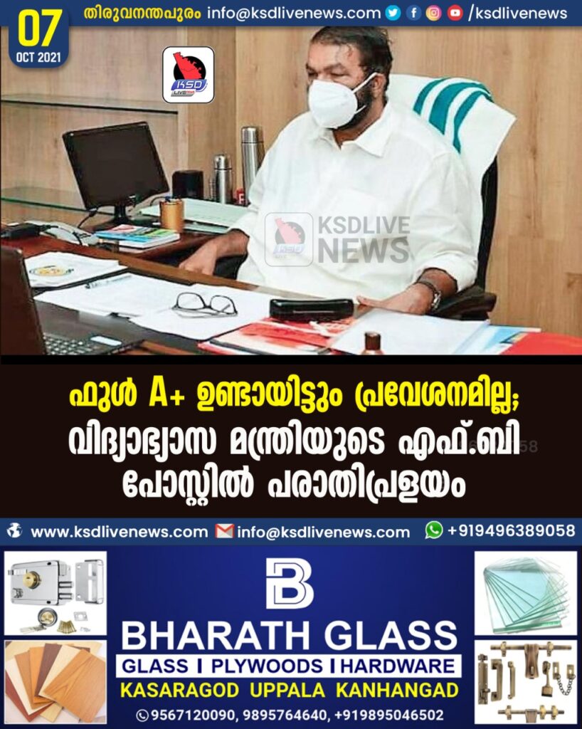 ഫുള് A+ ഉണ്ടായിട്ടും പ്രവേശനമില്ല; വിദ്യാഭ്യാസ മന്ത്രിയുടെ എഫ്.ബി പോസ്റ്റില് പരാതിപ്രളയം