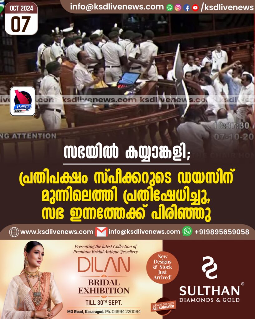 സഭയിൽ കയ്യാങ്കളി; പ്രതിപക്ഷം സ്പീക്കറുടെ ഡയസിന് മുന്നിലെത്തി പ്രതിഷേധിച്ചു, സഭ ഇന്നത്തേക്ക് പിരിഞ്ഞു