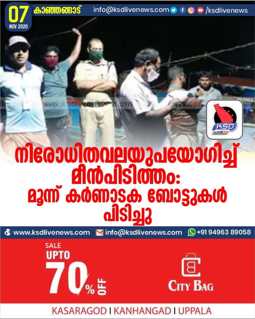 കാഞ്ഞങ്ങാട്: ഫിഷറീസ്വകുപ്പും തീരദേശപോലീസും നടത്തിയ കടൽപട്രോളിങ്ങിൽ നിരോധിതവല ഉപയോഗിച്ച് മീൻപിടിച്ച മൂന്ന് കർണാടക ബോട്ടുകൾ പിടികൂടി.