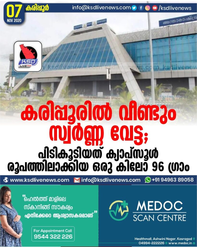 കരിപ്പൂരിൽ വീണ്ടും സ്വർണ്ണ വേട്ട ; പിടികൂടിയത് ക്യാപ്സൂൾ രൂപത്തിലാക്കിയ ഒരു കിലോ 96 ഗ്രാം