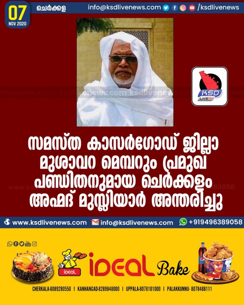 സമസ്ത കാസര്ഗോഡ് ജില്ലാ മുശാവറ മെമ്പറും പ്രമുഖ പണ്ഡിതനുമായ ചെർക്കളം അഹ്മദ് മുസ്ലിയാര് അന്തരിച്ചു