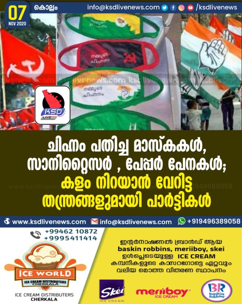 ചിഹ്നം പതിച്ച മാസ്കകൾ , സാനിറ്റൈസർ , പേപ്പർ പേനകൾ ; കളം നിറയാൻ വേറിട്ട തന്ത്രങ്ങളുമായി പാർട്ടികൾ