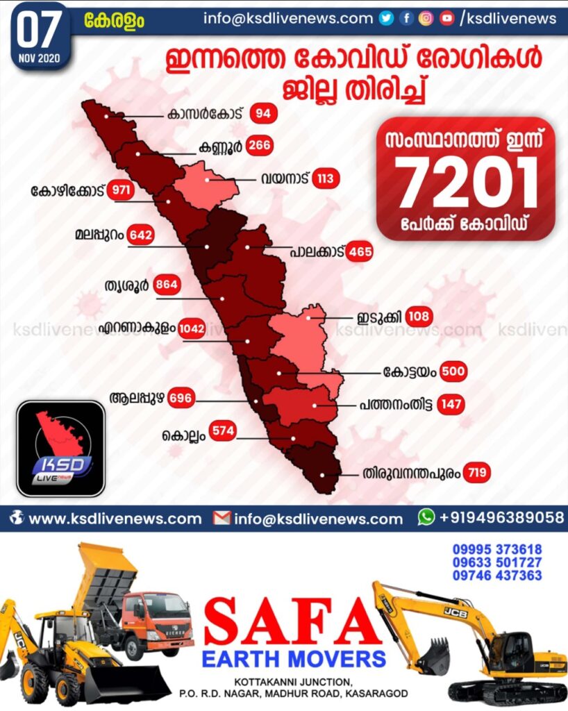 സംസ്ഥാനത്ത് ഇന്ന് 7201 പേര്ക്ക് കോവിഡ്-19 സ്ഥിരീകരിച്ചു. എറണാകുളം 1042, കോഴിക്കോട് 971, തൃശൂര് 864, തിരുവനന്തപുരം 719, ആലപ്പുഴ 696, മലപ്പുറം 642, കൊല്ലം 574, കോട്ടയം 500, പാലക്കാട് 465, കണ്ണൂര് 266, പത്തനംതിട്ട 147, വയനാട് 113, ഇടുക്കി 108, കാസര്ഗോഡ് 94 എന്നിങ്ങനേയാണ് ജില്ലകളില് ഇന്ന് രോഗ ബാധ സ്ഥിരീകരിച്ചത്.