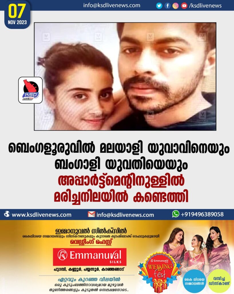 ബെംഗളൂരുവിൽ മലയാളി യുവാവിനെയും ബംഗാളി യുവതിയെയും അപ്പാർട്ട്മെന്റിനുള്ളിൽ മരിച്ചനിലയിൽ കണ്ടെത്തി