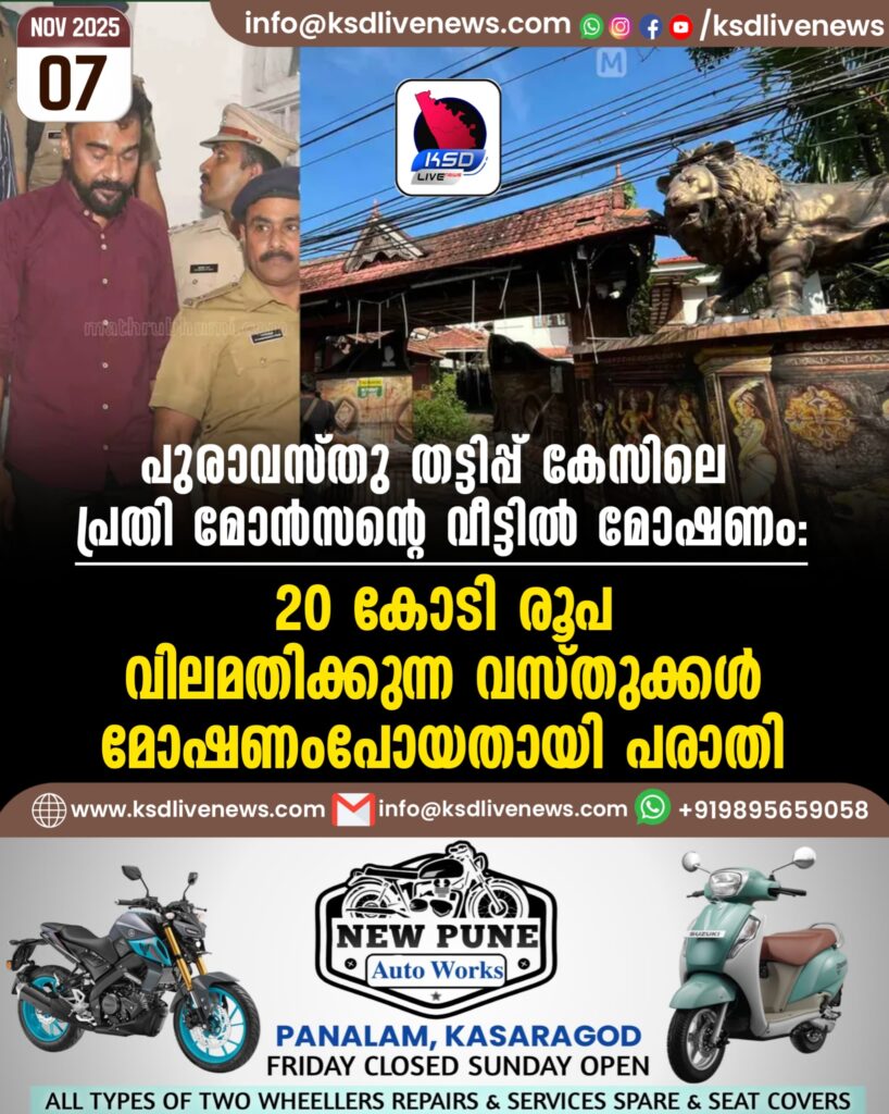 പുരാവസ്തു തട്ടിപ്പ് കേസിലെ പ്രതി മോന്സന്റെ വീട്ടില് മോഷണം: 20 കോടി രൂപ വിലമതിക്കുന്ന വസ്തുക്കള് മോഷണംപോയതായി പരാതി