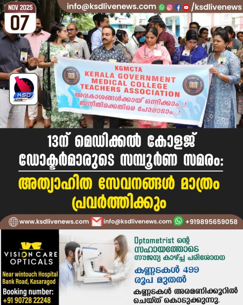 13ന് മെഡിക്കൽ കോളജ് ഡോക്ടർമാരുടെ സമ്പൂർണ സമരം: അത്യാഹിത സേവനങ്ങൾ മാത്രം പ്രവർത്തിക്കും