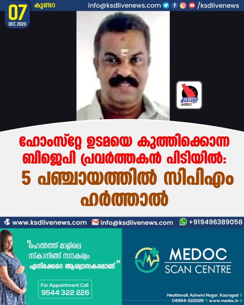ഹോംസ്‌റ്റേ ഉടമയെ കുത്തിക്കൊന്ന ബിജെപി പ്രവര്‍ത്തകന്‍ പിടിയില്‍ : 5 പഞ്ചായത്തില്‍ സിപിഎം ഹര്‍ത്താല്‍