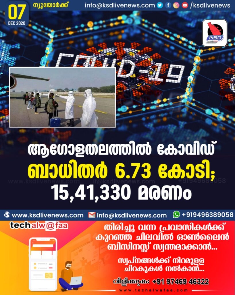 ആഗോളതലത്തിൽ കോവിഡ് ബാധിതർ 6.73 കോടി ; 15,41,330 മരണം