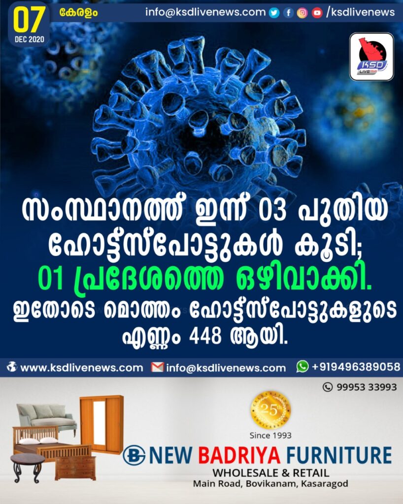 സംസ്ഥാനത്ത് ഇന്ന് 03 പുതിയ ഹോട്ട്സ്പോട്ടുകള് കൂടി; 01 പ്രദേശങ്ങളെ ഒഴിവാക്കി. ഇതോടെ മൊത്തം ഹോട്ട്സ്പോട്ടുകളുടെ എണ്ണം 448 ആയി.