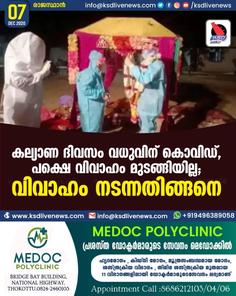 പക്ഷെ രാജസ്ഥാനിലെ കെല്‍വാരയില്‍ ഒരു വിവാഹം അടുത്തിടെ നടന്നു. വിവാഹ സമയത്ത് വധുവിന് കൊവിഡ് പോസിറ്റീവ് ആയിരുന്നു വരന്‍ നെഗറ്റീവും. എല്ലാവിധ കൊവിഡ് പ്രോട്ടോക്കോളും പാലിച്ച്‌ സ്ഥലത്തെ പ്രധാന മെഡിക്കല്‍ ഓഫീസറുടെ സാന്നിധ്യത്തിലാണ് വിവാഹം നടന്നത്. എങ്ങനെ എന്നല്ലേ? രാജസ്ഥാനിലെ കിഷന്‍ഗഞ്ജ് ബ്ലോക്കിലെ നഹര്‍ഗര്‍ഹ് നിവാസിയാണ് വധു. വിവാഹത്തിന് ദിവസങ്ങള്‍ക്ക് മുന്‍പാണ് വധുവിന്റെ അമ്മാവനും ഭാര്യയ്ക്കും കൊവിഡ് പോസിറ്റീവ് ആയത്. തുടര്‍ന്ന് ആരോഗ്യ പ്രവര്‍ത്തകര്‍ പ്രതിശ്രുത വധു ഉള്‍പ്പെടെ കുടുംബാംഗങ്ങളെ ടെസ്റ്റിന് വിധേയമാക്കി. റിസള്‍ട്ട് വന്നതോ വിവാഹ ദിവസവും, വധുവിനും അമ്മയ്ക്കും പോസിറ്റീവ്.