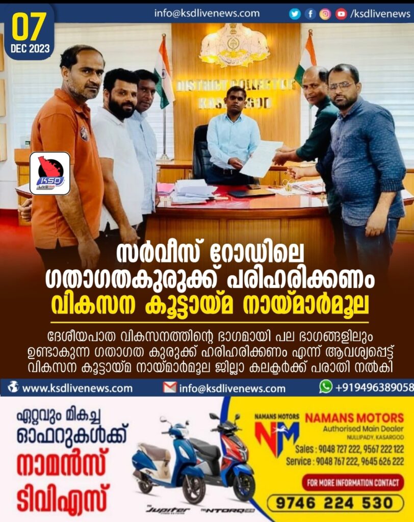 നായ്മാർമൂല : ദേശീയപാത വികസനത്തിന്റെ ഭാഗമായി പല ഭാഗങ്ങളിലും ഉണ്ടാകുന്ന ഗതാഗത കുരുക്ക് ഹരിഹരിക്കണം എന്ന് ആവശ്യപ്പെട്ട് വികസന കൂട്ടായ്മ നായ്മാർമൂല ജില്ലാ കലക്ടർക്ക് പരാതി നൽകി . യാത്ര ചെയ്യുന്ന ബസ്സുകൾ ആളുകളെ ഇറക്കാനും കയറ്റാനും റോഡിൽ തന്നെ നിർത്തിയിടുന്നതിനാൽ പിറകെ വരുന്ന മറ്റു വാഹനങ്ങൾക്ക് മറികടന്ന് പോകാൻ സാധിക്കുന്നില്ലായെന്നും കലക്ടറേറ്റ് ജംഗ്ഷനിലെ ബി സി റോഡിൽ സർവീസ് റോഡ് കയ്യേറി ഓട്ടോറിക്ഷ പാർക്കിങ്ങുകളും മത്സ്യങ്ങൾ കച്ചവടം ചെയ്യുന്നവരും മറ്റുള്ള കച്ചവടങ്ങളും ഉള്ളതിനാൽ സർക്കാർ ജീവനക്കാർക്കും. സ്കൂൾ വിദ്യാർത്ഥി വിദ്യാർത്ഥിനികൾക്കും മറ്റുള്ള അനേകം യാത്രക്കാർക്കും വളരെ തടസ്സം നേരിടുന്ന അവസ്ഥ ആണെന്നതും കലക്ടറുടെ ശ്രദ്ധയിൽപെടുത്തി പ്രസ്തുത വിഷയത്തിൽ അടിയന്തരമായ ഇടപെടൽ ഉണ്ടാകുമെന്ന് കലക്ടർ ഉറപ്പുനൽകി. ഇബ്രാഹിം എൻ എം നായന്മാർമൂല. ശിവദാസൻ കെ എസ്. മജീദ്.എം എ. അഷ്റഫ് എൻ എം. ബഷീർ പി എം , തുടങ്ങിയവർ ഈ വിഷയത്തിൽ പരാതി സമർപ്പിച്ചു.