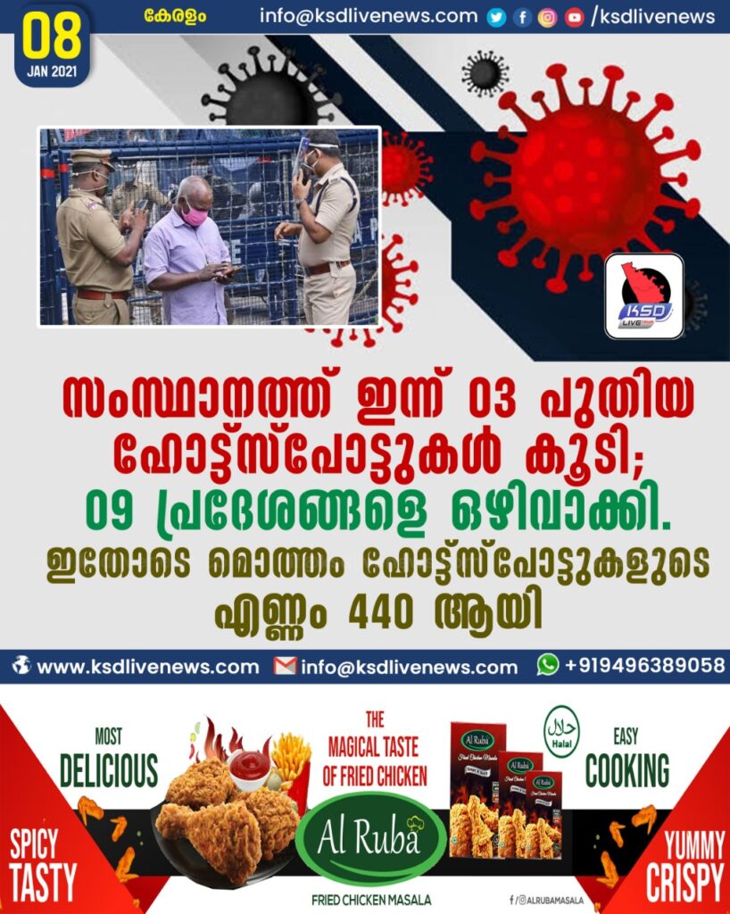 സംസ്ഥാനത്ത് ഇന്ന് 03 പുതിയ ഹോട്ട്സ്പോട്ടുകള് കൂടി; 09 പ്രദേശങ്ങളെ ഒഴിവാക്കി. ഇതോടെ മൊത്തം ഹോട്ട്സ്പോട്ടുകളുടെ എണ്ണം 440 ആയി.