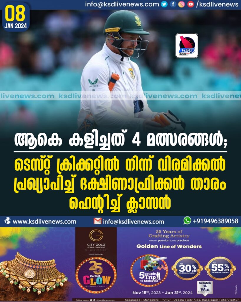 ആകെ കളിച്ചത് 4 മത്സരങ്ങൾ; ടെസ്റ്റ് ക്രിക്കറ്റിൽ നിന്ന് വിരമിക്കൽ പ്രഖ്യാപിച്ച് ദക്ഷിണാഫ്രിക്കൻ താരം ഹെൻറിച്ച് ക്ലാസൻ