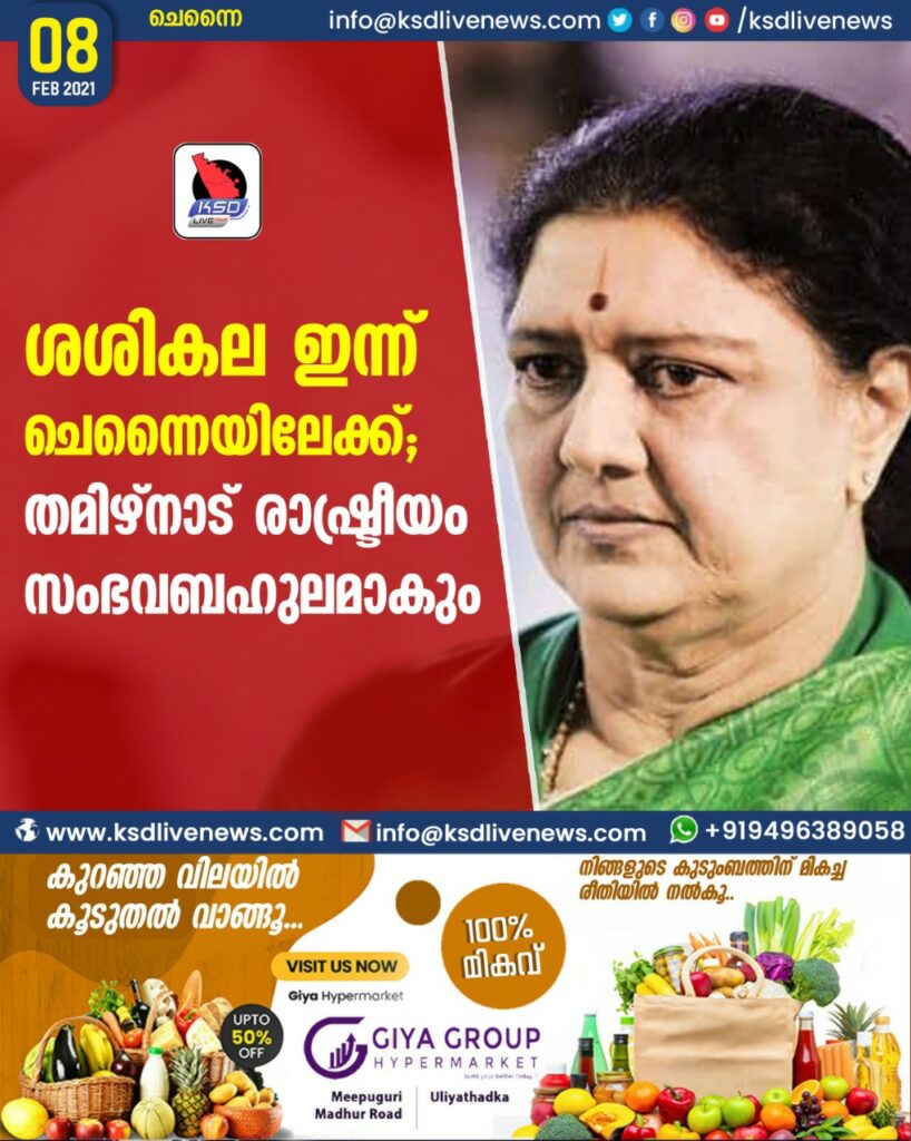 ശശികല ഇന്ന് ചെന്നൈയിലേക്ക്; തമിഴ്നാട് രാഷ്ട്രീയം സംഭവബഹുലമാകും