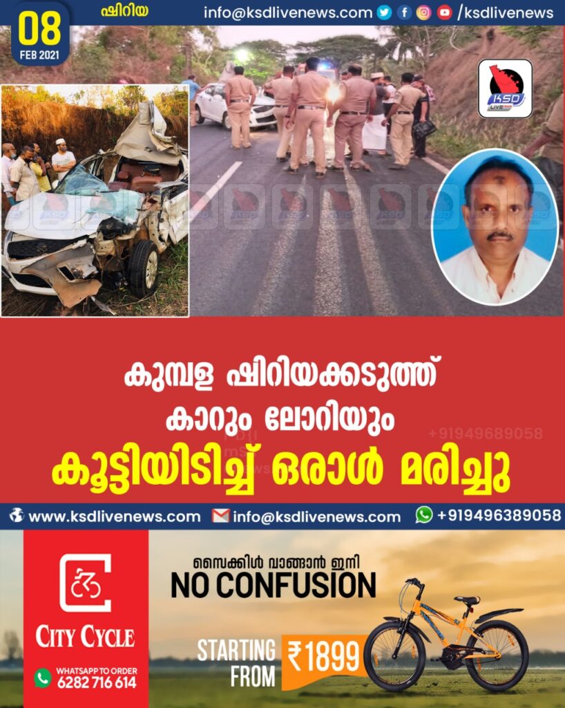 കുമ്പള ഷിറിയക്കടുത്ത് കാറും ലോറിയും കൂട്ടിയിടിച്ച് ഒരാൾ മരിച്ചു