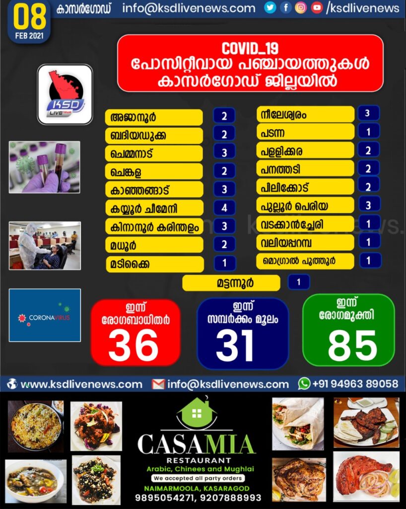 കാസർഗോഡ് ജില്ലയിൽ ഇന്ന് കോവിഡ് സ്ഥിരീകരിച്ചവരുടെ പഞ്ചായത്ത് തിരിച്ചുള്ള സ്ഥിതി വിവര കണക്ക്