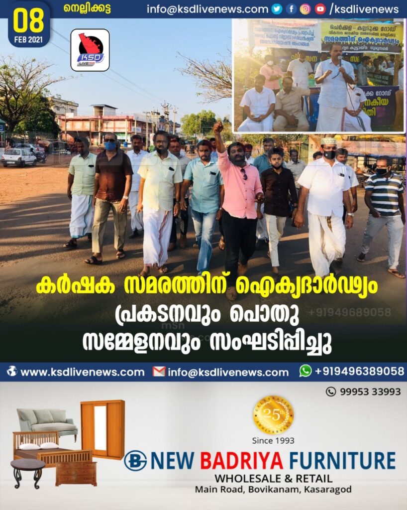 നെല്ലിക്കട്ട: വികസന ജനകീയ സമര സമിതി നെല്ലിക്കട്ടയുടെ നേതൃത്വത്തിൽ ഡൽഹിയിൽ നടക്കുന്ന കർഷർക സമരത്തിന് ഐക്യദാർഢ്യം പ്രകടിപ്പിച് നെല്ലിക്കട്ടയിൽ പ്രകടനവും പൊതു സമ്മേളനവും സംഘടിപ്പിച്ചു. വില്ലേജ് ഓഫീസ് പരിസരത്ത് നിന്ന് ആരംഭിച്ച പ്രകടനം സമര പന്തലിൽ അവസാനിച്ചു. പൊതു സമ്മേളനം മാഹിൻ കേളോട്ട് ഉദ്ഘാടനം ചെയ്തു. അബൂബക്കർ ഗിരി അധ്യക്ഷത വഹിച്ചു, കുഞ്ഞി കൃഷ്ണൻ LIC, എൻ.എ അബ്ദുൾ കാദർ, ബി.കെ ബഷീർ പൈക്ക, ലത്തീഫ് പള്ളത്തടുക്ക, മഹമൂദ് തൈവളപ്പ്, ഫാറൂഖ് & ഫാറൂഖ് , ഫൈസൽ നെല്ലിക്കട്ട, തുടങ്ങിയവർ സംബന്ധിച്ചു. ഇബ്രാഹിം നെല്ലിക്കട്ട സ്വാഗതവും അനീഫ അൽ അമീൻ നന്ദിയും പറഞ്ഞു.