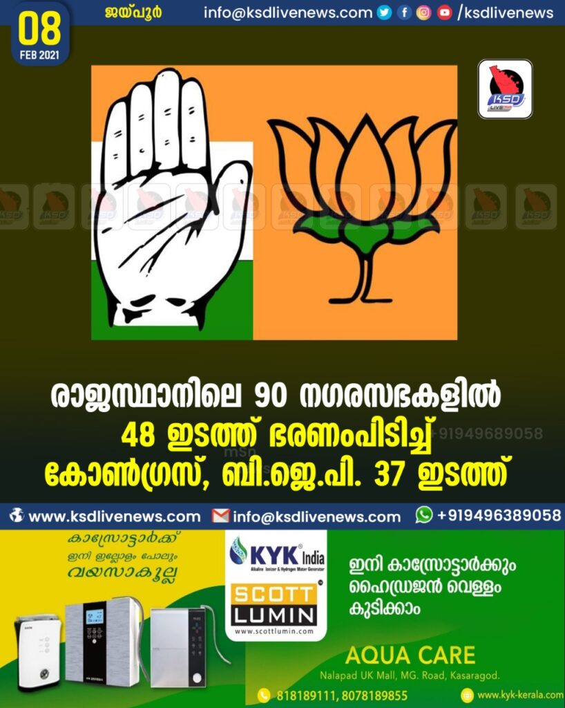 രാജസ്ഥാനിലെ 90 നഗരസഭകളില് 48 ഇടത്ത് ഭരണംപിടിച്ച് കോണ്ഗ്രസ്, ബി.ജെ.പി. 37 ഇടത്ത്