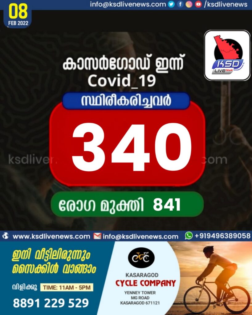 കാസര്കോട് ജില്ലയിൽ 340 പേർ കൂടി കോവിഡ്-19 പോസിറ്റീവായി. ചികിത്സയിലുണ്ടായിരുന്ന 856
