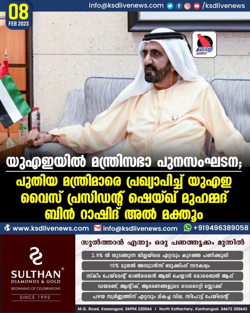 യുഎഇയില് മന്ത്രിസഭാ പുനസംഘടന; പുതിയ മന്ത്രിമാരെ പ്രഖ്യാപിച്ച് യുഎഇ വൈസ് പ്രസിഡന്റ് ഷെയ്ഖ് മുഹമ്മദ് ബിന് റാഷിദ് അല് മക്തൂം