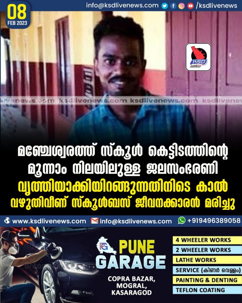 മഞ്ചേശ്വരത്ത് സ്കൂള് കെട്ടിടത്തിന്റെ മൂന്നാം നിലയിലുള്ള ജലസംഭരണി വൃത്തിയാക്കിയിറങ്ങുന്നതിനിടെ കാല് വഴുതി വീണ് സ്കൂൾ ബസ് ജീവനക്കാരൻ മരിച്ചു