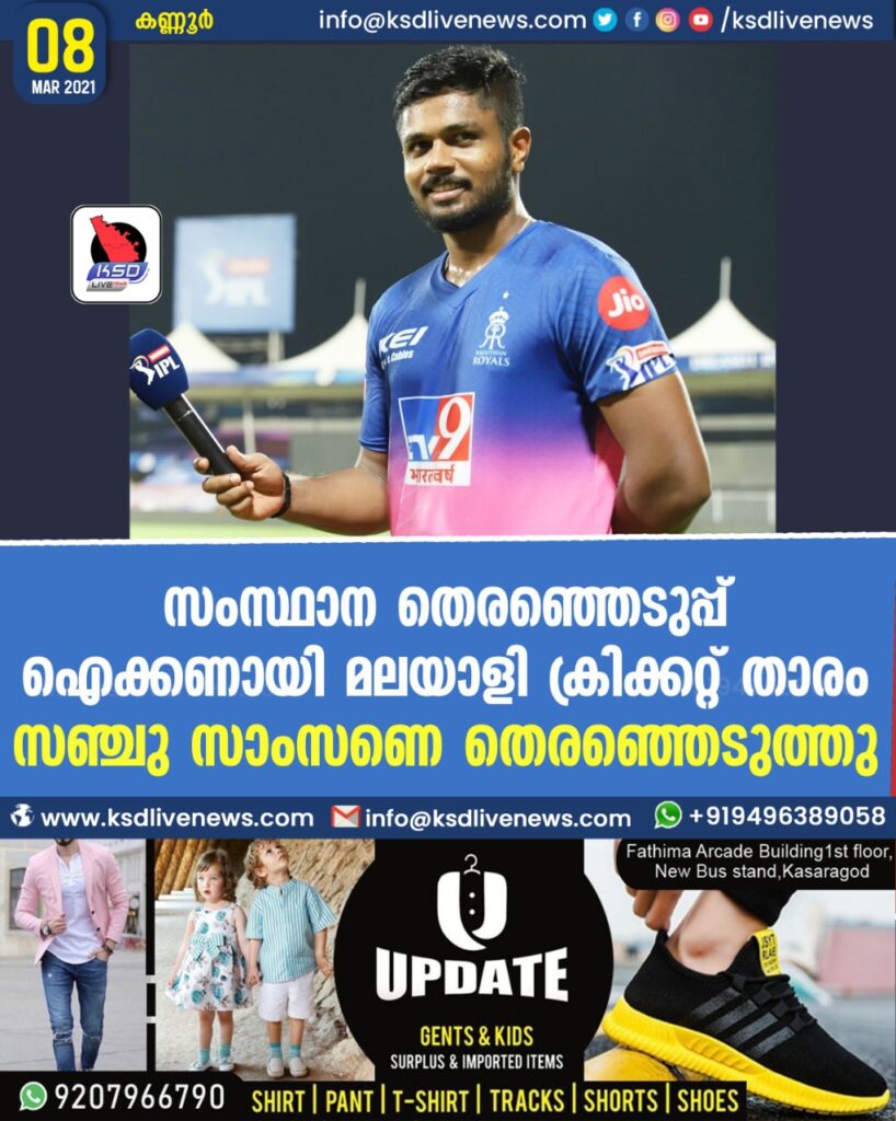 സംസ്ഥാന തെരഞ്ഞെടുപ്പ് ഐക്കണായി മലയാളി ക്രിക്കറ്റ് താരം സഞ്ചു സാംസണെ തെരഞ്ഞെടുത്തു