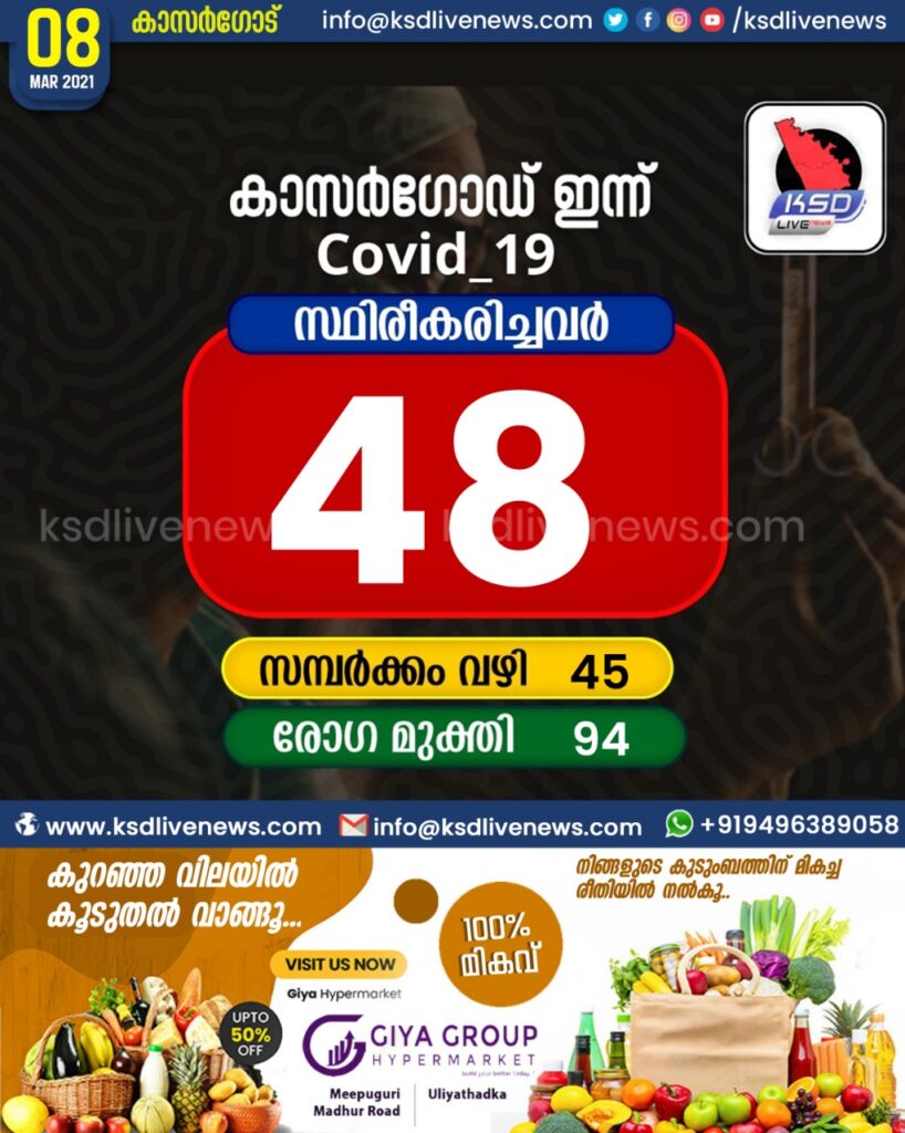 കാസർഗോഡ് ജില്ലയിൽ ഇന്ന് 48 പേർക്ക് കോവിഡ് സ്ഥിരീകരിച്ചു. സമ്പർക്കം വഴി 45 പേർക്കും. 94 പേർക്ക് രോഗമുക്തി